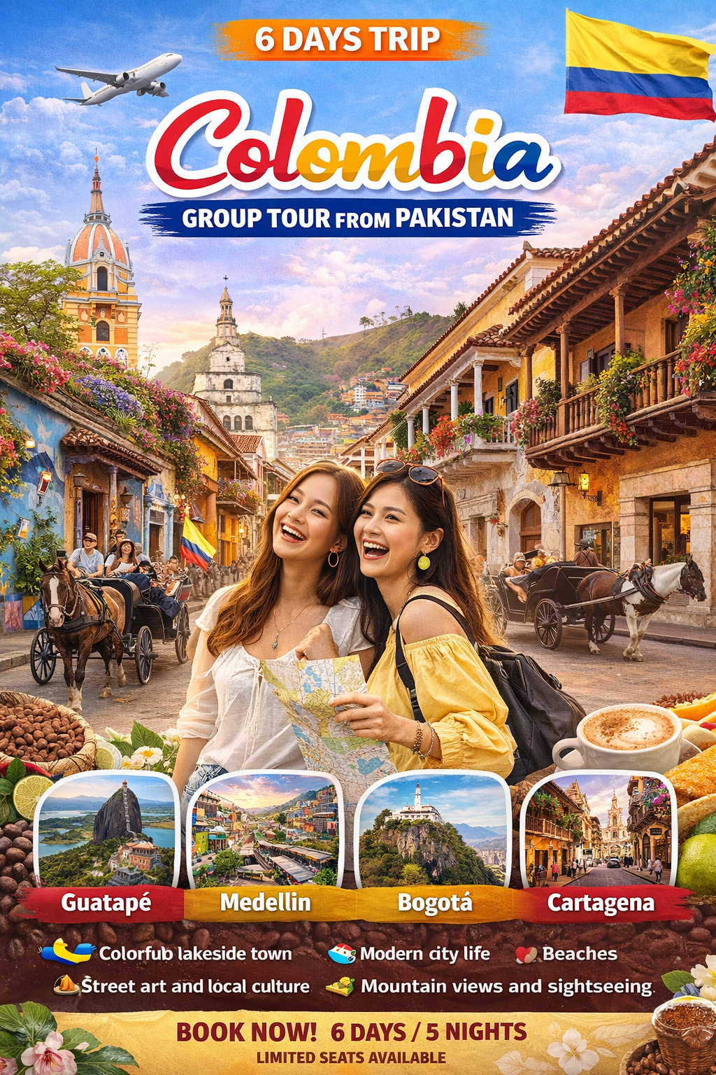 Discover the beauty of Colombia with our exclusive group tour from Pakistan. Explore vibrant cities, historic landmarks, colorful streets, local cuisine, and breathtaking natural scenery. This tour is designed for travelers who want to experience Colombian culture, shopping, entertainment, and famous tourist attractions in a comfortable and organized way. Our package includes flights, hotel accommodation, guided sightseeing, transportation, and complete travel support. Enjoy a safe, memorable, and professionally managed journey with trusted services and dedicated assistance throughout your trip.